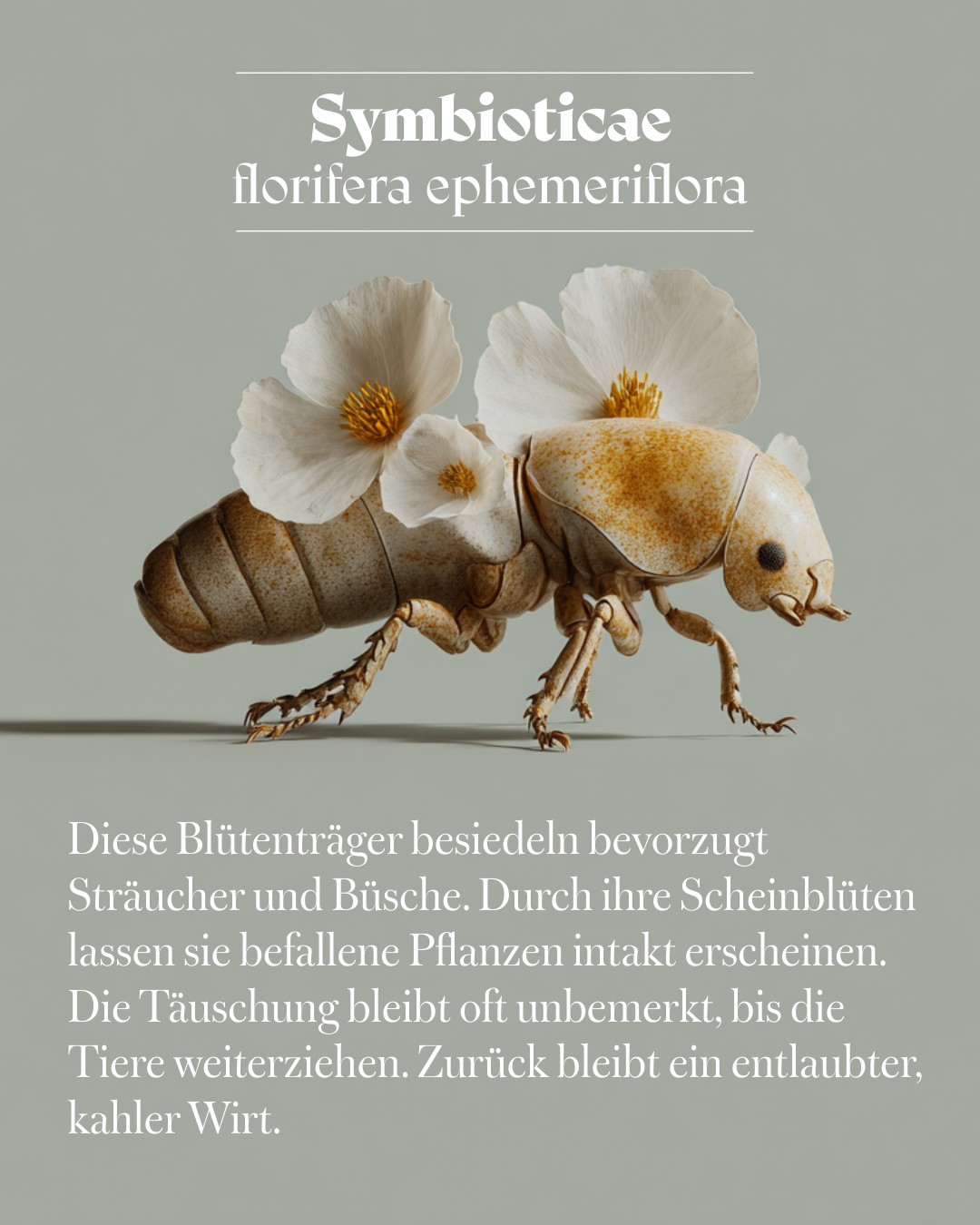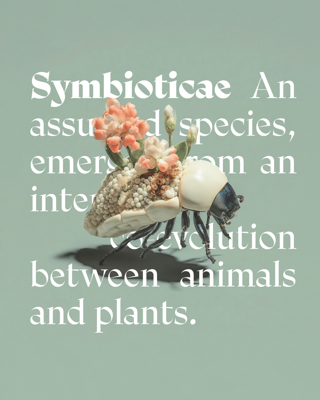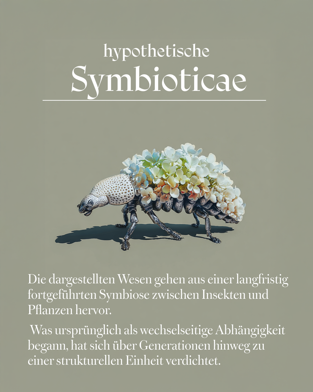 Die dargestellten Wesen gehen aus einer langfristig intensivierten Symbiose zwischen Insekten und Pflanzen hervor. Von einer wechselseitigen Abhängigkeit ausgehend, hat sich über Generationen hinweg eine strukturelle Einheit gebildet.